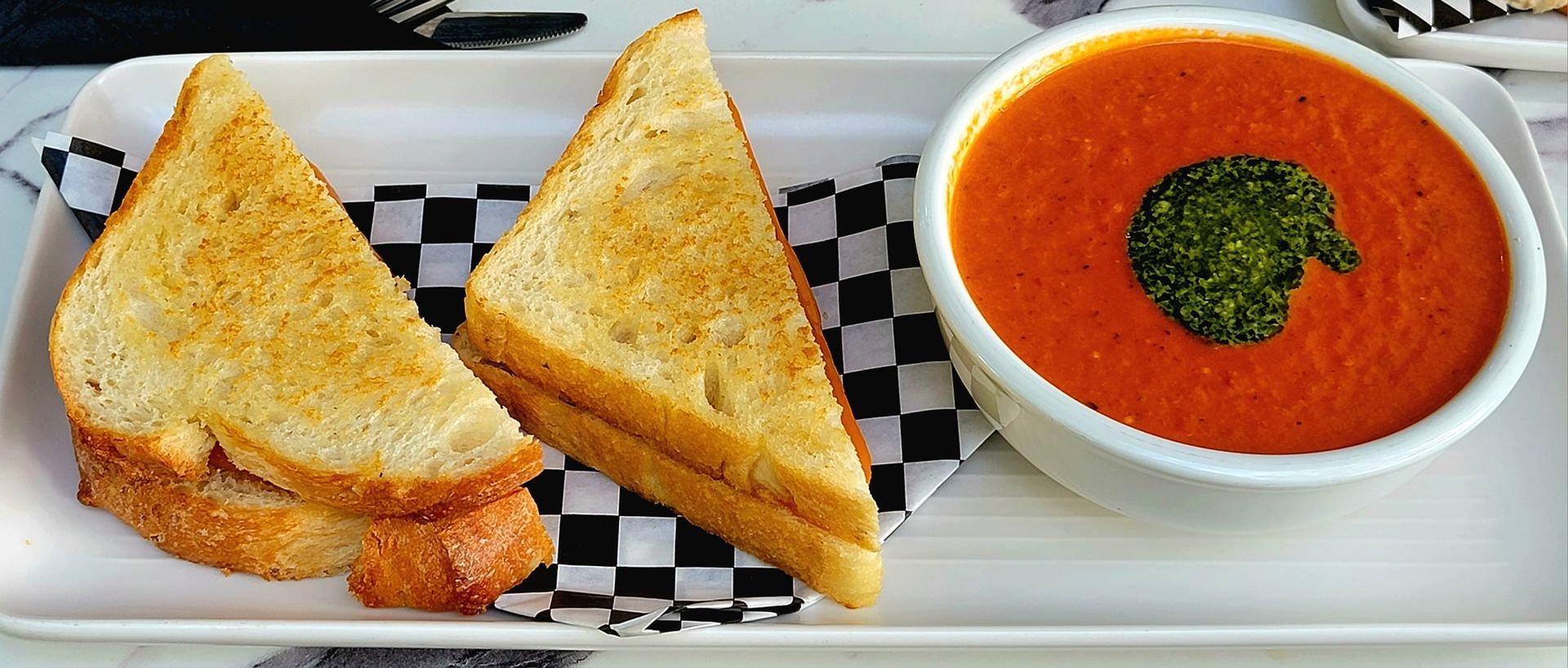 Mozzarella, Tomatoes, Pesto, Basil on a Focaccia Bread Served with Your Choice of Side