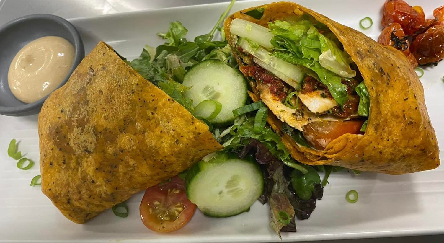 Roasted Veggies, Onions, Tomatoes, Cucumber, Arugula, Balsamic Reduction on a Flour Tortilla Served with Your Choice of Side